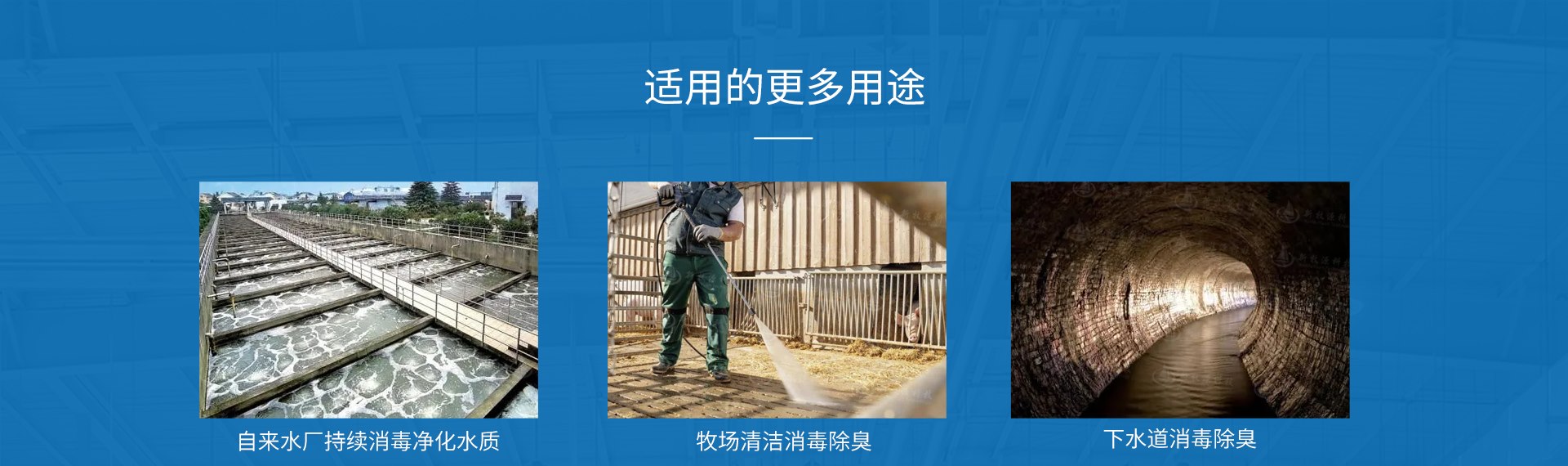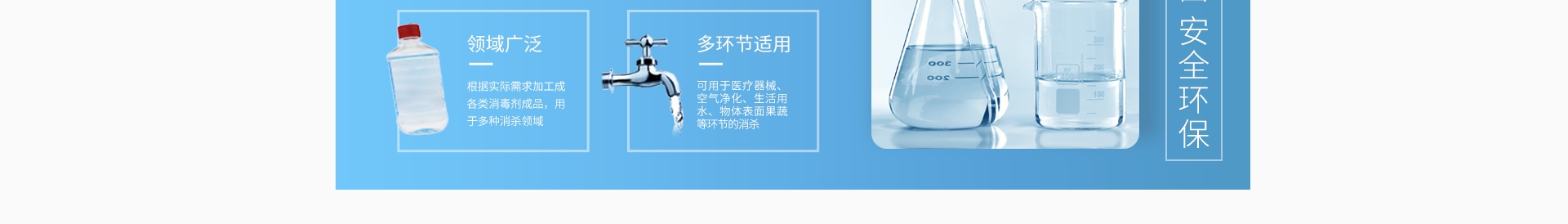 具有安全、環保、廣泛、快速、高效殺菌、不用二次沖洗,成本低廉,低殘留,不會產生有害物質,使用后可直接排放等優點??蓮V泛應用于食品加工、農畜牧、水產、大型超市、中央廚房等行業。