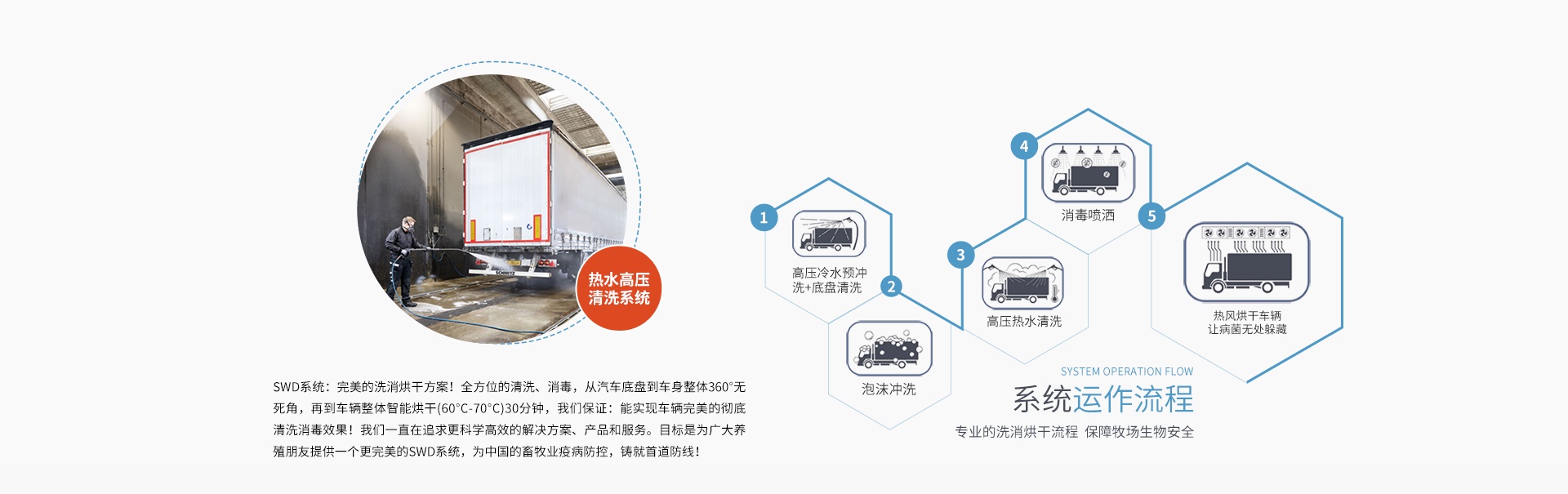 SWD系統(tǒng):完美的洗消烘干方案!全方位的清洗、消毒,從汽車底盤到車身整體360°無死角,再到車輛整體智能烘干(60℃-70℃)30分鐘,我們保證:能實(shí)現(xiàn)車輛完美的徹底清洗消毒效果!我們一直在追求更科學(xué)高效的解決方案、產(chǎn)品和服務(wù)。目標(biāo)是為廣大養(yǎng)殖朋友提供一個更完美的SWD系統(tǒng),為中國的畜牧業(yè)疫病防控,鑄就首道防線!