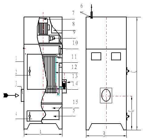 含塵氣體進(jìn)入箱體,由扁布袋過(guò)濾器進(jìn)行過(guò)濾,粉塵被阻留在除塵布袋外表面,已凈化的氣體通過(guò)濾袋進(jìn)入風(fēng)機(jī),由風(fēng)機(jī)吸入直接排入室內(nèi)(也可接管排至室外)。